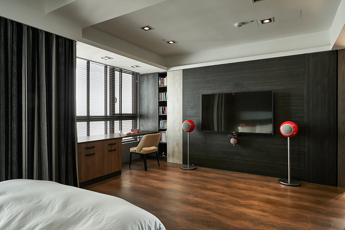 欣賞完主臥來到兒子房,是一種沉穩的深色木紋空間,而衣櫃門是灰黑色玻璃門板,在沒有燈光的情況下不會看到門後衣櫃景象,燈光開起才會發現暗藏一空間,在業界為第一品牌系統家具的三商美福板材選擇多,在書桌、玄關、衣櫃用其設計,造型大方易輕潔 耐用又耐看。